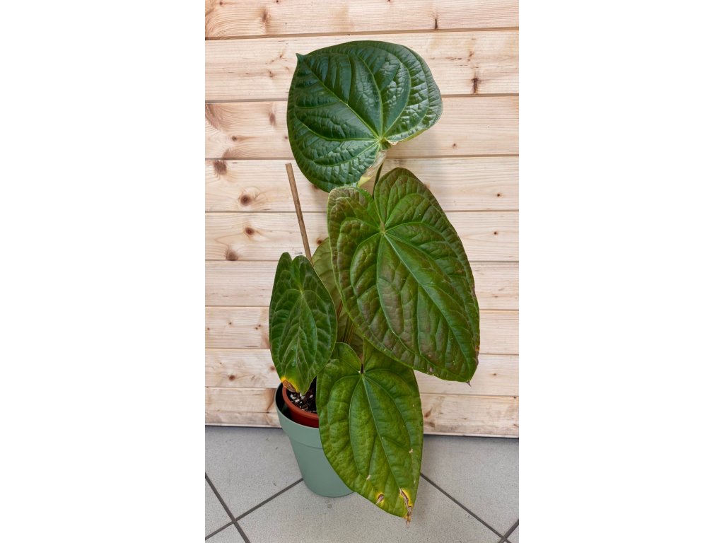 Anthurium luxurians × radicans je nádherný hybrid, který kombinuje to nejlepší z obou rodičů – kompaktní růst a výrazně strukturované, „bublinaté“ listy. Listy jsou sytě zelené, pevné a mají hluboce reliéfní povrch, který působí téměř plasticky. Díky své textuře a kompaktnímu tvaru patří mezi velmi vyhledávané sběratelské anthurium.