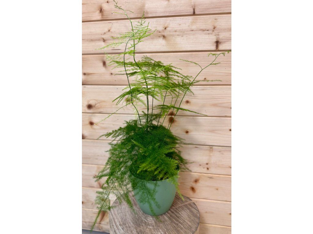 Asparagus sp. je lehká a elegantní rostlina s jemnými, jehličkovitými výhonky, které vytvářejí hustý, vzdušný porost připomínající zelený obláček. Díky svému jemnému vzhledu působí velmi dekorativně a přináší do interiéru svěžest a lehkost. Skvěle se hodí jako doplněk k výraznějším rostlinám nebo do závěsných nádob.