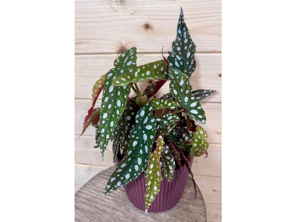 Begonia maculata, známá také jako „polka dot begonie“, je ikonická pokojová rostlina s dlouhými tmavě zelenými listy posetými výraznými stříbrnými puntíky. Spodní strana listů kontrastuje s krásnou vínově červenou barvou, díky čemuž rostlina působí jako živé umělecké dílo. Je elegantní, originální a okamžitě upoutá pozornost v každém interiéru.