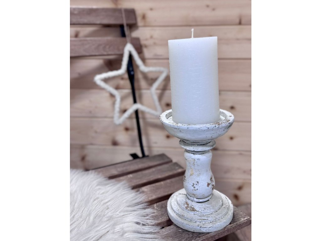 Bílý vintage svícen vnese do vašeho domova romantickou a starobylou atmosféru. Jemné patinování a dekorativní detaily dodávají elegantní šarm, který krásně vynikne při rozsvícené svíčce. Stylový doplněk pro útulné večery i slavnostní dekorace.