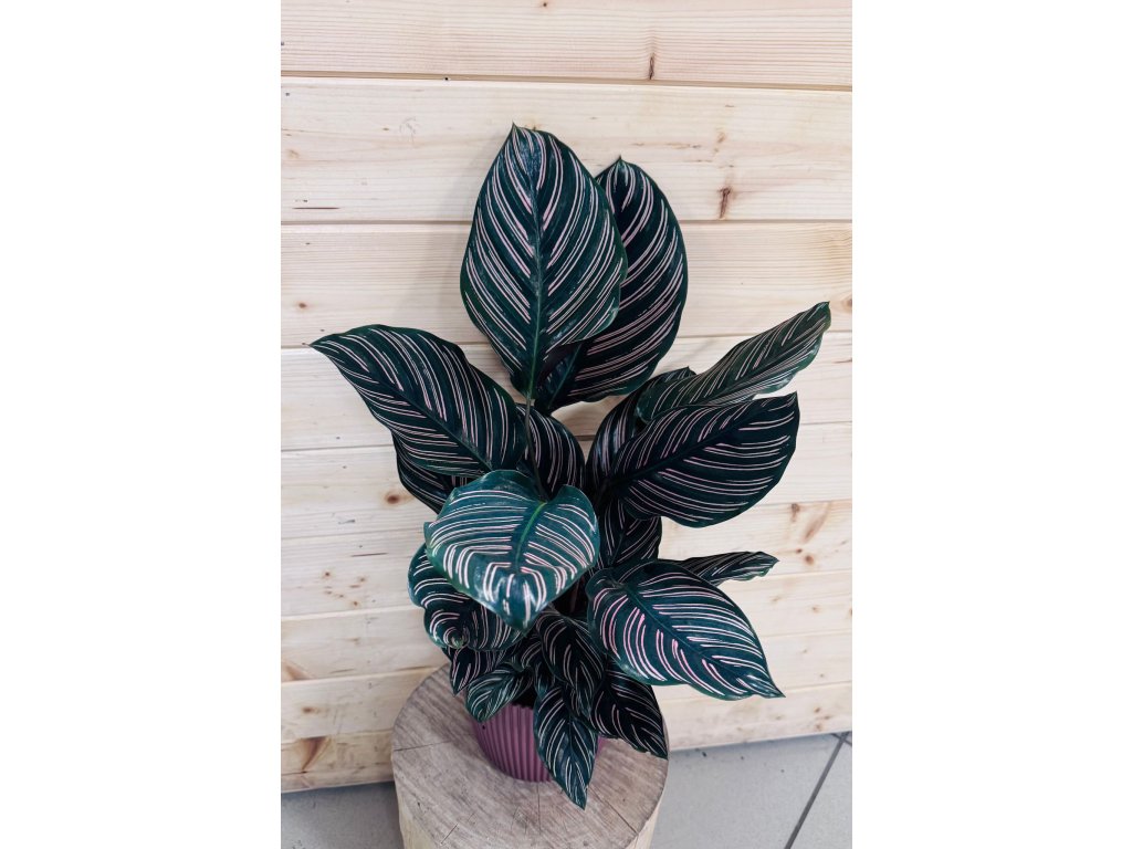 Calathea ‘Ornata’ je výrazná a velmi elegantní pokojová rostlina známá svými tmavě zelenými listy zdobenými tenkými růžovými proužky, které působí téměř jako ruční malba. Spodní strana listů má jemný vínový nádech, což rostlině dodává další hloubku a exotický vzhled. Je ideální volbou pro milovníky dekorativních listových rostlin s nádechem luxusu.