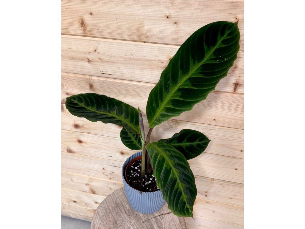 Calathea warscewiczii je nádherná tropická rostlina s velkými, sametově tmavě zelenými listy zdobenými světlejším vzorem připomínajícím jemné malování. Spodní strana listů má sytě vínový až purpurový odstín, který dodává rostlině hloubku a luxusní vzhled. Díky své textuře patří mezi nejelegantnější kalatey.