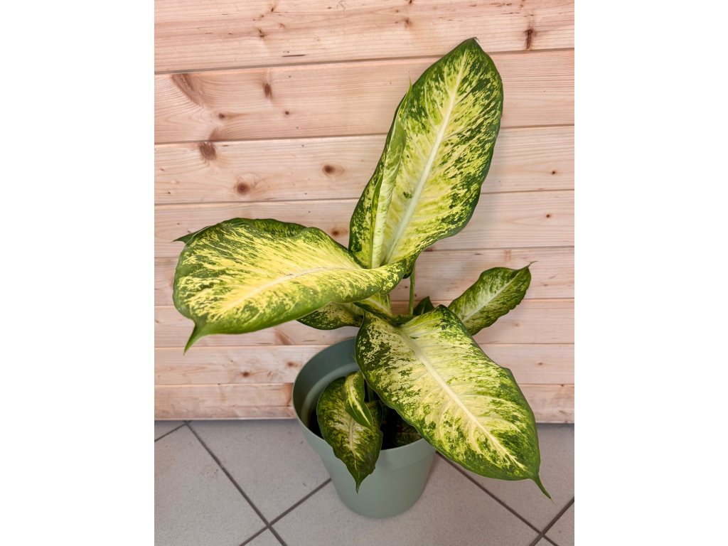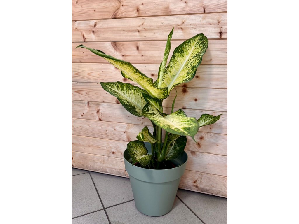 Dieffenbachia ‘Bravo’ je výrazná pokojová rostlina s velkými, širokými listy zdobenými kontrastní kresbou v odstínech zelené a krémové. Světlé středy listů přecházejí do tmavších okrajů, což vytváří elegantní a zároveň velmi živý vzhled. Díky svému tropickému charakteru je ideální jako výrazný solitér do interiéru.