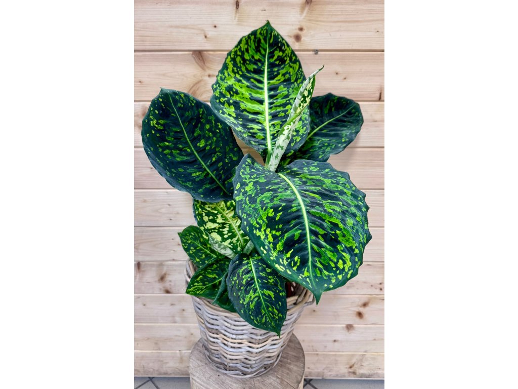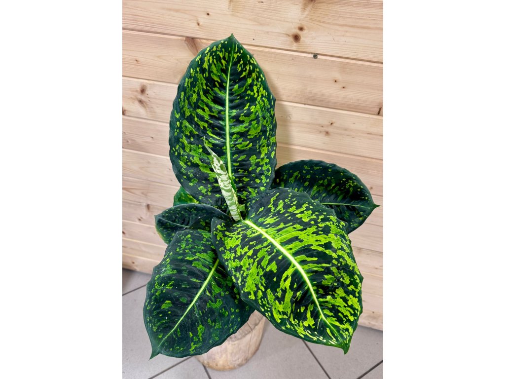 Dieffenbachia ‘Reflector’ je mimořádně dekorativní pokojová rostlina, která zaujme svými tmavě zelenými listy s výrazným, téměř neonově zeleným panašováním a nepravidelnou kresbou. Kontrast mezi tmavým podkladem a světlým středem listu vytváří dramatický, luxusní efekt, díky kterému rostlina působí jako živý designový prvek. Je ideální volbou pro ty, kteří chtějí něco opravdu nepřehlédnutelného.