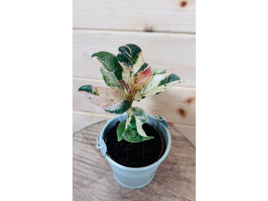Ficus elastica ‘Moonshine’ je moderní a elegantní odrůda gumovníku, která zaujme svými velkými, pevnými listy ve světle zelených až stříbřitých tónech. Nové listy mají jemně světlý, téměř matný nádech, díky kterému rostlina působí čistě, minimalisticky a velmi stylově. Je ideální volbou do moderních interiérů i kanceláří.