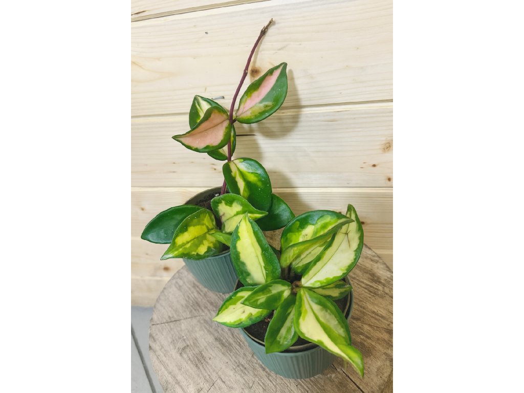Hoya carnosa ‘Tricolor’ je jedna z nejkrásnějších panašovaných voskovek, která okouzlí kombinací růžové, krémové a zelené barvy na pevných, lesklých listech. Nové přírůstky mají často výrazně růžový nádech, který postupně dozrává do jemnějších tónů. Tato hoya je nejen dekorativní listem, ale při správné péči vás odmění i nádhernými, sladce vonícími květy.
