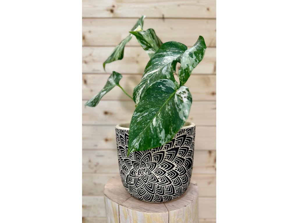 Květináč s černou mandalou zaujme svým originálním a výrazným designem. Spojení čistého podkladu a detailního ornamentu působí moderně i harmonicky zároveň. Stylový doplněk, který podtrhne krásu rostlin a ozdobí váš domov či terasu.
