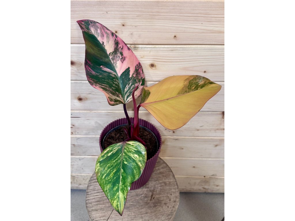 Philodendron ‘Strawberry Shake’ je vzácná a velmi žádaná odrůda s nádherným panašováním v odstínech růžové, červené, krémové a zelené. Je to variegovaná forma populárního Philodendronu ‘Red Emerald’, a právě díky svému jedinečnému barevnému mixu připomínajícímu jahodový koktejl dostala své jméno. Každý list je originál a rostlina působí jako živé umělecké dílo.