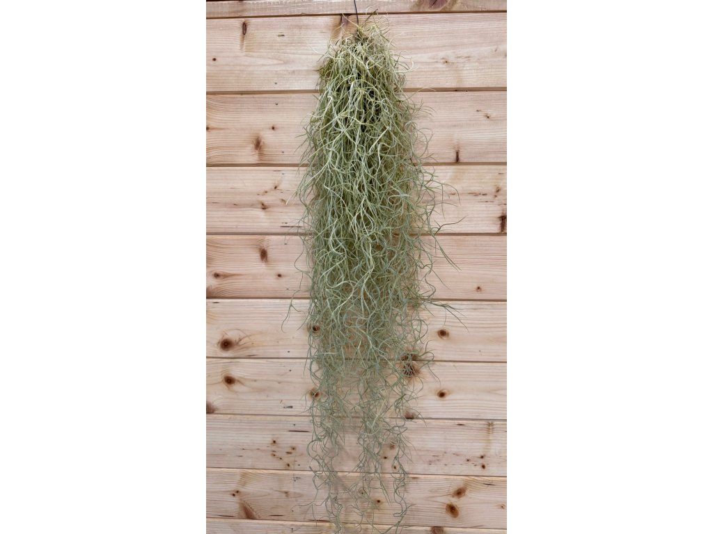 Tillandsia usneoides je fascinující epifytní rostlina, která nepotřebuje klasický substrát. Vytváří dlouhé, jemné šedozelené provázky, které volně splývají dolů a připomínají závěsy z mechu. Díky svému lehkému, vzdušnému vzhledu působí velmi dekorativně a je ideální do moderních interiérů, závěsných aranžmá nebo terárií.